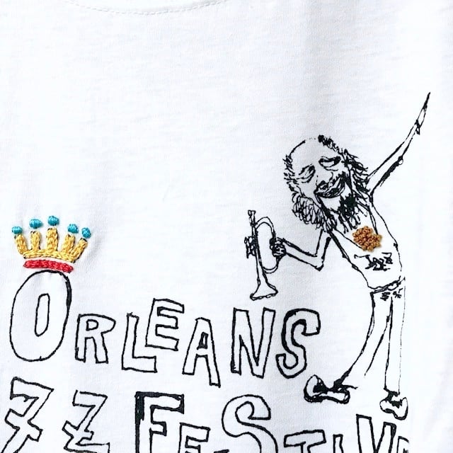 「ニューオーリンズジャズフェスおじさん」オリジナルイラスト 手刺繍 レディースワイド Tシャツ